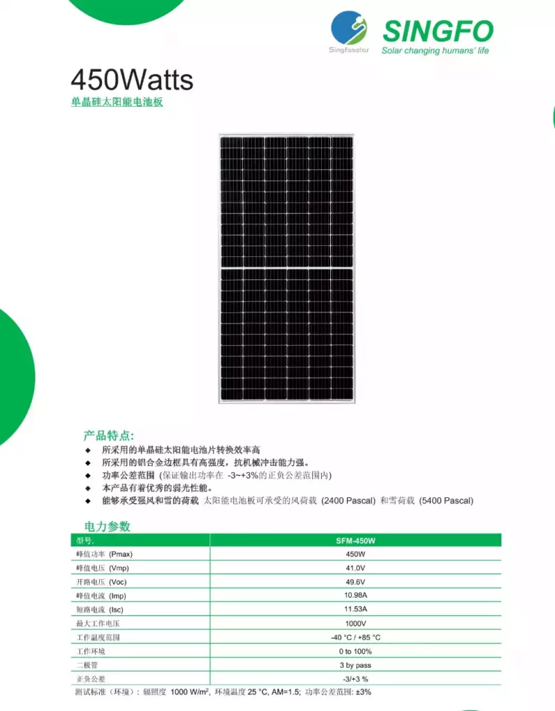 首页/光伏面板/SINGFO SFM-450W 促销 🔍 SINGFO SFM-450W¥950.00 ¥800.00 SINGFO(星火)层压太阳能电池板/组件,单晶硅太阳能电池板 SINGFO SFM-450W SINGFO SFM-450W quantity Add to cart SKU: SINGFO-SFM-450W-001 Category: 光伏面板 Description Additional information Reviews (0) Weight 28.5 kg Dimensions 1134 × 2279 × 70 cm Reviews There are no reviews yet. Be the first to review “SINGFO SFM-450W”取消回复您的邮箱地址不会被公开。 必填项已用 * 标注Your rating * Rate… Perfect Good Average Not that bad Very poor 名称 *邮箱 *Your review * 在此浏览器中保存我的显示名称、邮箱地址和网站地址,以便下次评论时使用。 Submit Related products 促销 SINGFO SFM-540W ¥1,100.00 ¥980.00 光伏面板Add to cart 促销 LONGI LR4-72HBD-455M ¥980.00 ¥690.00 Rated 5.00 out of 5光伏面板Add to cart 促销 LONGI-LR5-72HGD-585M ¥1,200.00 ¥850.00 光伏面板Add to cart